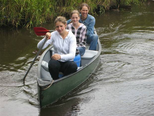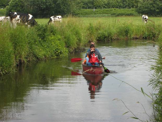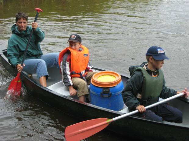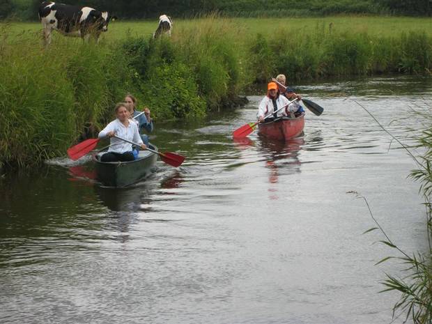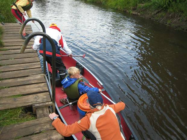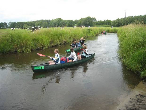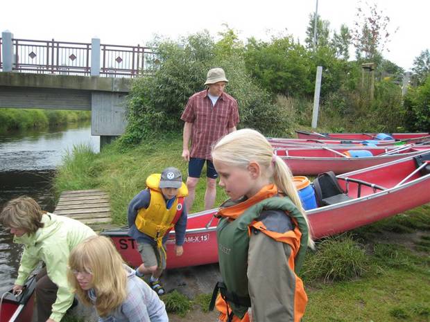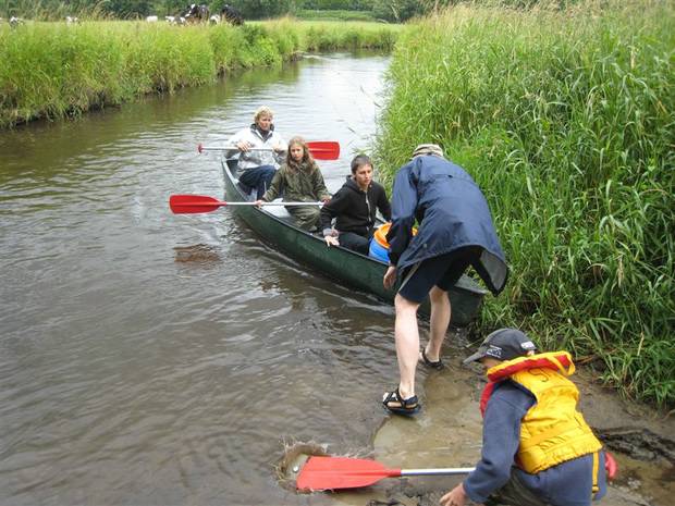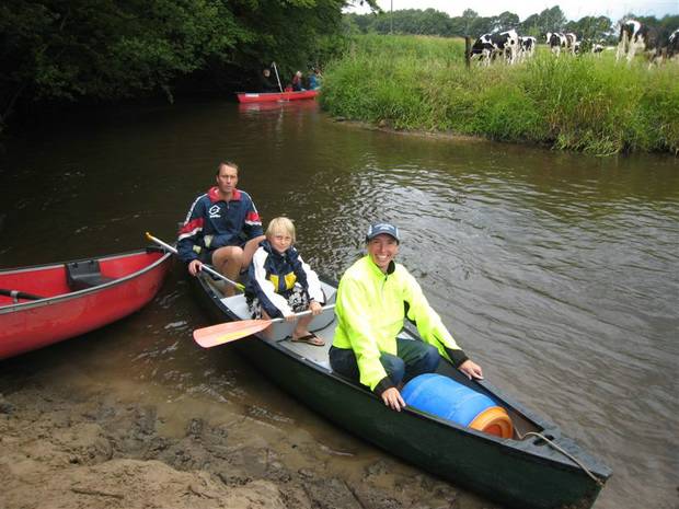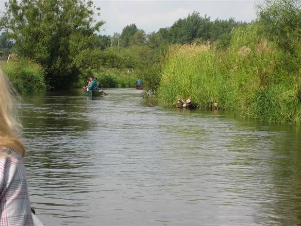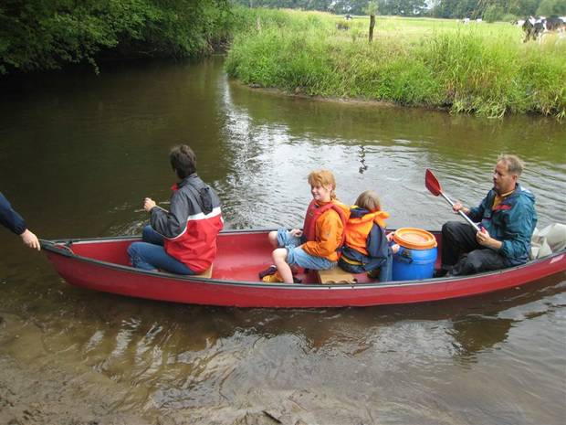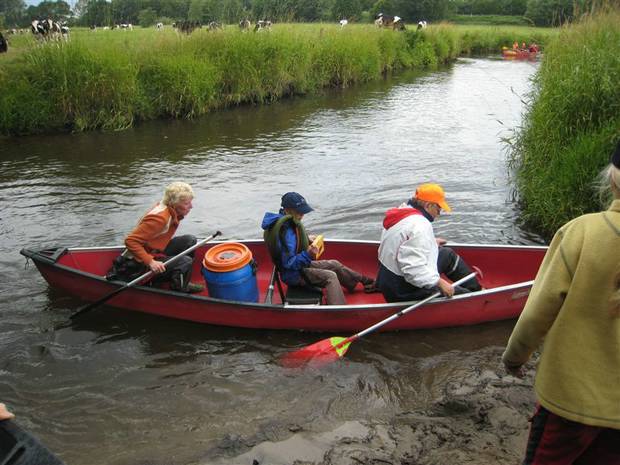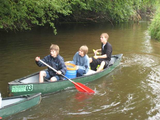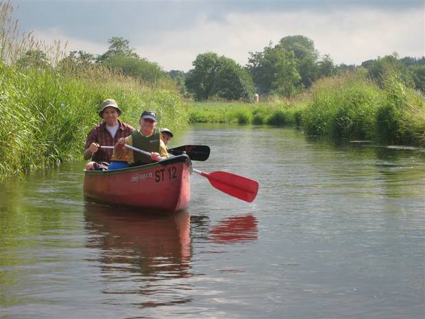 Kanufahrt auf der Treene Am Samstag, 12.07.2008 trafen sich Mitglieder vom RuFV Großenwiehe nicht, wie gewohnt, auf dem Turnierplatz sondern bei einer Kanufahrt auf der Treene. Abfahrt war in Langstedt, wo die 10 Kanus auf die 30 Kanufahrer warteten. Das Gepäck wurde in den wassersicheren Tonnen verstaut. Bei einigen dachte man, sie wollten 3 Tage unterwegs sein. Doch die Fahrt ging nur bis Sollerup und dauerte ca. 3 Stunden. Es gab eine kurze Einweisung des Kanusverleihers und einige Tipps, wie z.B. wenn man eine Rechtskurve fährt, muss der Steuermann seinen Paddel rechts einsetzen und die vordere Person paddelt links, oder war es andersrum? Einige fanden es auf der gesamten Strecke nicht heraus! Voller Elan ging es los mit dem Paddeln. Es dauerte nicht lange, da waren alle ziemlich nass, denn es gab einen kräftigen Schauer. Bis zur Pause nach der halben Strecke waren alle wieder halbwegs getrocknet, bis zum nächsten Schauer, der sich allerdings als Dauerregen entpuppte. Hinzu kam, dass die Treene noch kurviger wurde als in der ersten Hälfte und so mancher einmal freiwillig das Kanu verließ, um nicht in den Büschen zu landen. Am Ziel war auf jeden Fall keiner mehr trocken, doch die Stimmung ließ sich dadurch nicht trüben. Der Tag wurde mit einem gemeinsamen Grillen auf der Reitanlage in Großenwiehe abgeschlossen. Wir freuen uns auf eine Wiederholung der Kanufahrt im nächsten Jahr bei hoffentlich besserem Wetter. Jana u. Nadja Sönnichsen