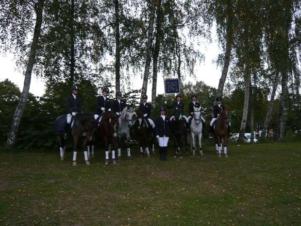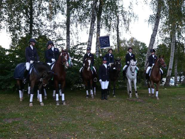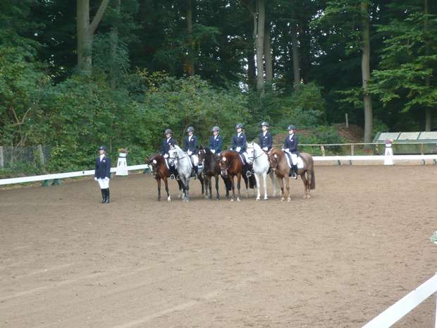 42. Landesponyturnier 2008 am 26./27. September 2008 "Geht nicht - gibt's nicht" hatte sich das diesjährige Pony-Team zum Motto gemacht und stellte sich der schwierigen Aufgabe, am Erfolg der letzten beiden Jahre anzuknüpfen. Es hat zwar nicht zu Platz 2 oder 3 gereicht, doch schafften die Ponyreiter es mit einer ordentlichen Portion Glück und guten Ergebnissen in den einzelnen Teilprüfungen den beachtlichen 8. Platz zu erlangen. Die Abteilungsaufgabe war leider nicht sehr glücklich verlaufen und verhinderte somit eine Platzierung im vorderen Bereich. Unsere beiden Springreiter hatten das schwierige Los, in der letzten Teilprüfung zu starten, doch Carolin und Thies Oke bewiesen starke Nerven und rissen mit ihren super Ritten das Ruder herum und verhalfen uns so zu einer Platzierung. Der Jubel war groß bei der mitgereisten Fan-Gemeinschaft. Wie in den letzten Jahren verbrachte die Mannschaft mit ihren TT's ein schönes Wochenende in Segeberg. Die Ponys waren in Kükels im Stall Winkler sehr gut untergebracht. Der Stallbesitzer war sehr um das Wohl seiner Einsteller besorgt. Er vergewisserte sich lieber telefonisch bei Astrid, ob das auf Späne stehende Pony tatsächlich schon Abendbrot hatte, denn es schaute ihn aus unschuldigen und ach so hungrigen Augen an. Morgens konnten wir dann feststellen, dass Cloud ihn doch überreden konnte, dass Frühstück auch in der Nacht sehr lecker schmeckt. Ein harmonisches und kameradschaftliches Wochenende ging dann gegen 19:00 Uhr am Sonntag nach dem Aufmarsch der 34. Mannschaften zu Ende. Und wie so häufig, standen wir TT's vor der schwierigen Aufgabe die schlafende Bande nach Hause zu kutschieren und dabei nicht selber einzuschlafen. Vergessen möchten wir an dieser Stelle nicht, ein herzliches Dankeschön an Astrid auszusprechen, die die jungen Reiterinnen und Reiter trainierte und in Segeberg betreute. Sie hat das richtig Gespür für die Auswahl der Mannschaft und deren Vorbereitung. Die Platzierungen vom RuFV Großenwiehe: Heyka Kasper Celina Feddersen Janina Zehmke Thies Oke Hansen Caroline Guddat Niklas-Marten Andresen Ponymannschaft