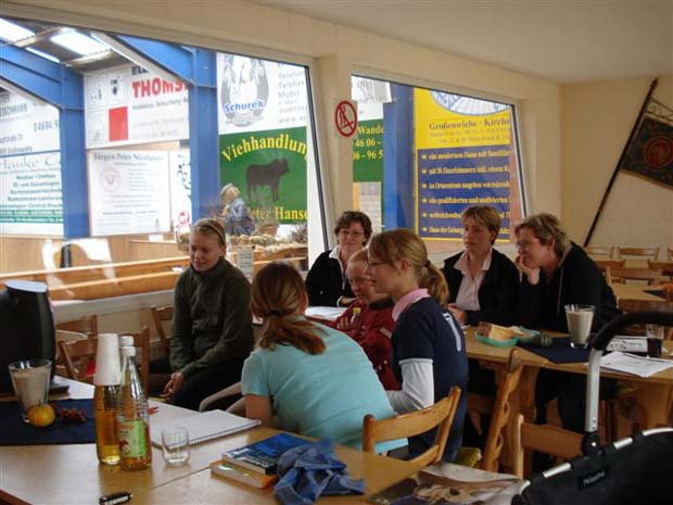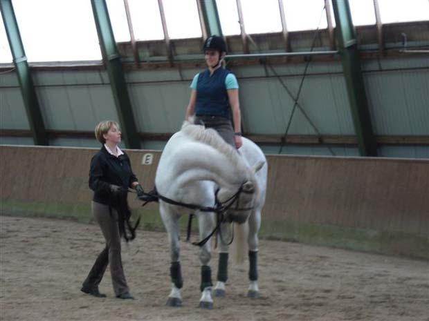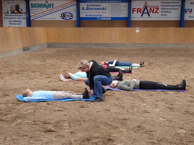 Sitzschulung und Reitergymnastik Am 02.09.2007 ging auf den ersten Blick in der großen Reithalle des Reit- und Fahrvereins Großenwiehe nichts Merkwürdiges vor. Eine kleine Gruppe von Reiterinnen ritt am frühen Sonntagmorgen in der Reithalle. Eigentlich nichts besonderes, aber bei genaueren Hinsehen bemerkte irgendwann jeder, dass da eine Kamera in der Ecke stand, die uns, unsere Pferde und vor allem unseren Sitz sogleich festhielt. Nach ca. einer Stunde reiten brachten alle ihre Pferde nach Hause und kamen danach zu einem kleinen Mittagsimbiss und der bevorstehenden Theorie in den Aufenthaltsraum der großen Reithalle. Nach eine kleinen Stärkung ging es dann auch prompt mit der Theorie los. Mit teilweise lustigen Übungen wurde uns der richtige Dressursitz von Eva Heide-Kühnhold und Marion Werlich (Physiotherapeutin) erläutert, die den Lehrgang leiteten. Auffällig war, dass die meisten Kursteilnehmer zuvor noch nie Begriffe wie "Dreipunktsitz", "Drehsitz" oder "Beckenkamm" gehört hatten, obwohl diese eigentlich grundlegend für die Reiterei sind. Somit konnte eine Stunde Theorieunterricht interessant gefüllt werden. Dann kam der Teil des Lehrgangs, den alle gespannt erwarteten. Videogucken! Es waren nur Aussagen wie "Bin ich das?" oder "Wie sitz ich denn auf'm Pferd???" zu hören, wer sieht sich denn schließlich schon mal selber, wenn er/sie auf einem Pferd reitet? Nachdem wir unsere Ritte und unseren Sitz auf dem Pferd begutachtet hatten, ging es an den mit Abstand anstrengensten Teil des Lehrgangs, die Reitergymnastik. Somit lagen alle in der Reithalle auf Isomatten und machten die Übungen, die Marion uns vorführte. Auch hier gab es lustige Bilder zu sehen. Danach ging es ab auf's Pferd, aber nicht auf das eigene. Eva stellte ihre Stute Chelsea zur Verfügung, somit konnte jeder an seinem Sitz arbeiten, da wir uns dank der Longe nicht um das "Lenken" kümmern mussten. Auch der Longenunterricht wurde wieder mit der Videokamera festgehalten und nachher analysiert. Jeder konnte Verbesserungen an den Reiterinnen erkennen. Plötzlich saßen alle "gerade"! Somit war der Lehrgang am Nachmittag abgeschlossen und alle waren sich einig, einen interessanten und lehrreichen Tag mit viel Spaß verbracht zu haben. An dieser Stelle möchten wir noch einen besonderen Dank an Eva,