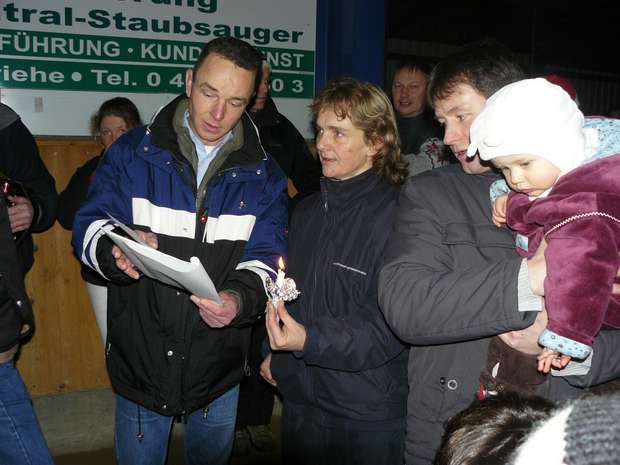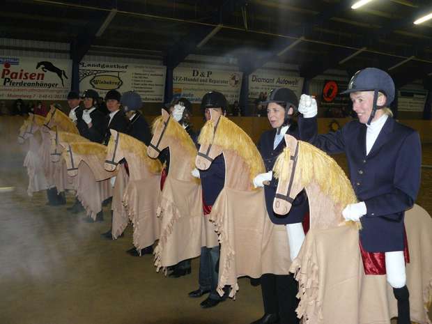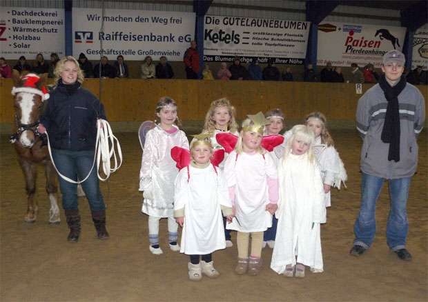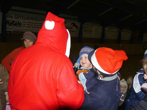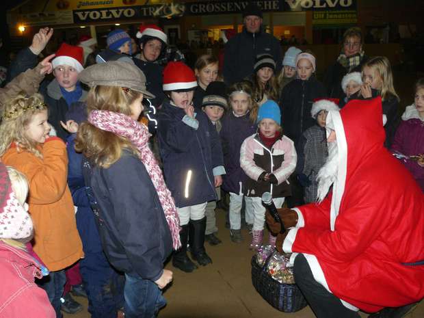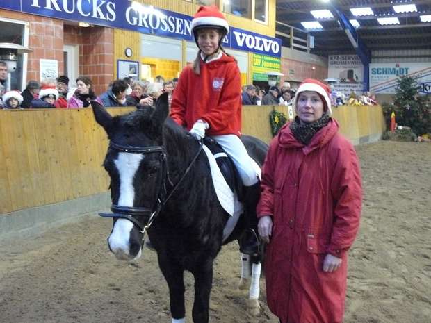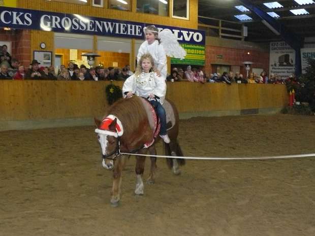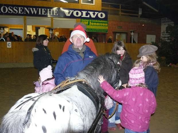 Buntes Programm beim Weihnachtsreiten in Großenwiehe. Ein Weihnachtsreiten lockte viele Besucher trotz des Weihnachtsmarktes in Großenwiehe, in die dortige Reithalle. Der Reit- und Fahrverein hatte ein tolles Programm zusammengestellt. Die kleinsten Mitglieder begannen mit ihren Vorführungen und bewiesen Sattelfestigkeit. Als nächstes begeisterten die Engel und ein Bengel die Zuschauer. Viel Beifall erhielt Hjördis Bahnsen, die mit ihrem Pony Mandy eine Einzel- A-Dressur vorritt. Die 8 Teilnehmer der Voltigiergruppe von Janine Otto sind alle zwischen 3 und 6 Jahre alt. Die meisten von ihnen voltigieren erst seit Oktober diesen Jahres. Unterstützt von Christopher Otto zeigten 7 von ihnen mit dem Pony Bravi was sie in dieser kurzen Zeit schon alles gelernt hatten. Aber nicht nur die Kinder sind in Großenwiehe sehr aktiv. Eine Reitergruppe, überwiegend Freizeitreiter, zeigte unter der Regie von Birgit Glückler eine super gerittene Senioren-Quadrille, bevor 3 junge Reiterinnen mit gekörten Pony- Hengsten des Gestütes Nordland das Publikum mit einer Springschouw begeisterten. Vorgeführt wurden die Hengste Dublin von Svea Bahnsen, Highway von Ann Christin Vollmer und unter Nina Hansen zeigte Antaris N sein gewaltiges Springvermögen. Gespannt warteten die zahlreichen Besucher auf Die goldenen Reiter. So manch einer unter ihnen hatte Olympia-Goldmedaillen- Gewinner Peter Thomsen und die Weltmeisterin Malin Larsson erwartet. Stattdessen kamen 9 Reiter und Reiterinnen auf Papppferden unter viel Gelächter und großem Beifall eingeritten und zeigten eine gekonnt gerittene Mannschafts-Dressur- und Quadrille. Der Höhepunkt des Nachmittags war noch nicht erreicht, denn alle Kinder warteten auf den Weihnachtsmann. Mit einer Kerze in der Hand, kamen die Kleinen und alle Teilnehmer, begleitet mit dem Lied Santa Lucia, in die dunkle Reithalle und bildeten einen Kreis. Das große Tor ging langsam auf und das Warten hatte sich gelohnt. Mit einer Pony-Kutsche kam der Weihnachtsmann in die Halle gefahren. Viele Kinder sagten ihr Gedicht auf und auch die Kleinen, die noch etwas schüchtern waren, erhielten eine bunte Tüte. Gemeinsam sang man Weihnachtslieder, die Nico Axelsen mit der Handharmonika begleitete. Mit einem Dank an die Jugendwartin Astrid Hanke-Springer und an alle