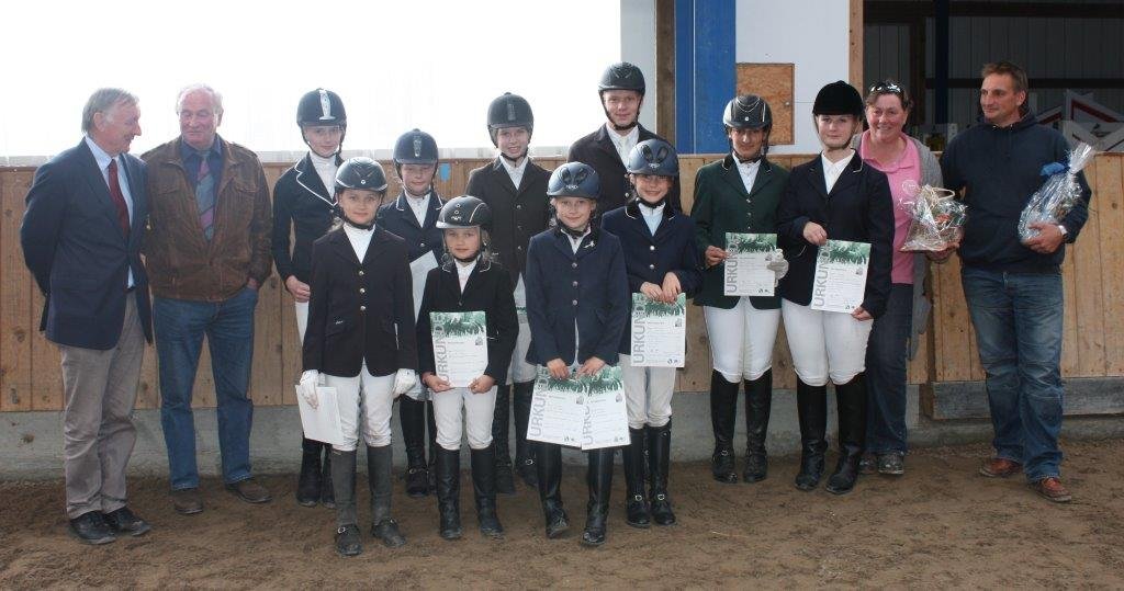 Foto Jürgensen: Folgende Kursteilnehmer im Bild haben bestanden. Vordere Reihe von links = Eileen Petersen; Ra 7 und Ra 6, Janne Mühlenbeck und Annie Thomsen; Ra 9 und Ra 8, Kaya Thomsen; Ra 4. Hintere Reihe von links = Klaus Dibbern und Jens Vollersen (Richter), Sophie Alma Christiansen; Ra 5, Finja Kropp; Ra 4, Kea Cardel; Ra 4, Hendrik Johannsen; Ra 4, Sara Baig; Ra 4, Tjorven Jepsen; Basispass und Ra 5.